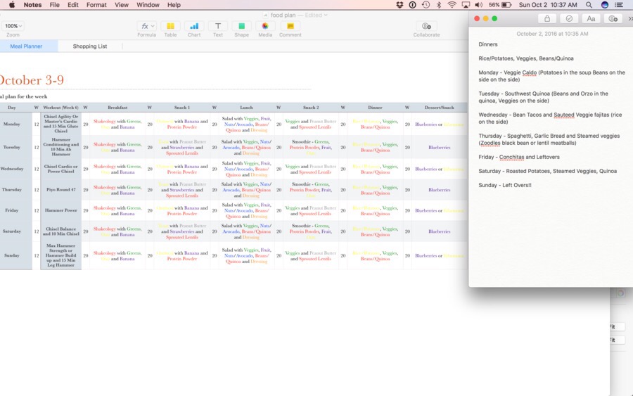 I am not 100% vegan or plant based, but I try to always stray closer to this way of eating than any other! Especially when pregnant! So I took the liberty of planning out a weeks worth of meals on a spreadsheet instead of on paper. This is what it looked like.
